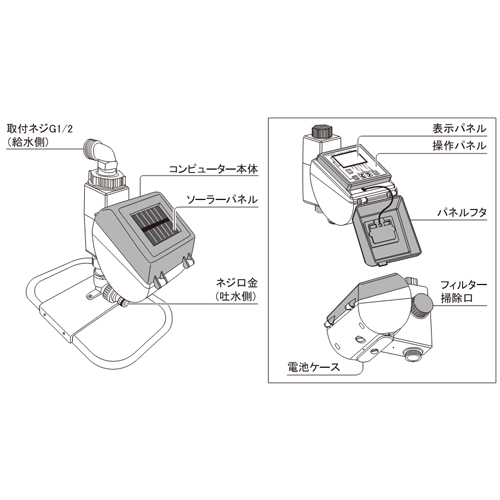 | 散水開始時間 | 00:00~23:59(1分単位で設定可能) 手動:随時実行可能 | 散水時間 | 自動水やり・手動水やりともに 1~30分(1分単位)、 30~90分(10分単位)、 2~9時間(1時間単位)で設定可能 ※手動水やりの初期設定は30分 |