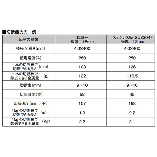 | 特殊な被覆剤を塗布してありますので、アークの安定性がよく、また被覆剤の耐熱性が大きくきわめて高い切断効率を発揮します。 |