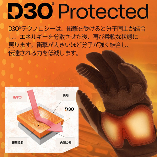 手の平部分のD3Oパディングで、大きな衝撃を吸収して、消散させます。