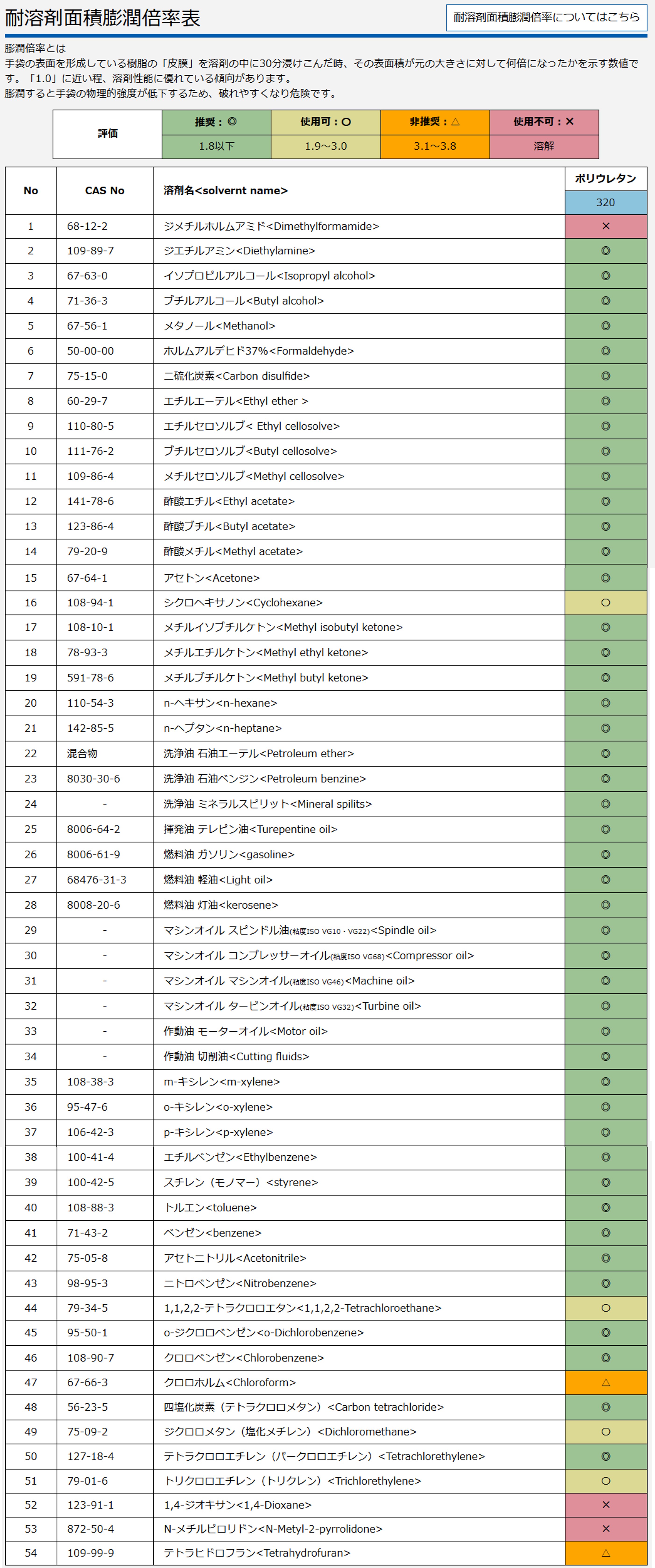 【注意事項】 ・手袋だけではアース効果がありません。服・靴・床等を含めた総合的な静電気対策が必要です。 (手袋が絶縁された状態では使用しないでください。) ・親指部内側の導電繊維を介して、表面に通電させています。必ず親指が導電繊維に接触した状態で使用してください。 ・取り扱う物質(油、溶剤、塗料など)が手袋に付着すると、手袋の電気抵抗値は変動します。特に、油や溶剤が手袋に染み込んだまま放置されると通電しない場合が有ります。使用前と使用中に電気抵抗値が規定範囲内であることを確認して下さい。もしも、手袋が汚れるなどして通電しない場合は、使用しないでください。 ・有機溶剤等で膨潤している場合、一般的に抵抗値が変動する傾向があります。十分に注意してください。 ・引火物を扱った後は手袋を火気に近づけないでください。着火する危険があります。 ・電気作業には使用しないでください。感電する危険があります。 ・当社の試験データは常温、単一溶剤での試験データです。ご使用になる環境や作業内容により、性能は変化しますので、ご注意ください。 ・製品によって対応できる溶剤・薬品は異なります。使用される溶剤・薬品のSDS(安全データシート)等で、配合成分を確認し、耐溶剤面積膨潤倍率表で使用可能かどうかをご確認ください。 ・酸・アルカリに使用しないでください。 ・ガス状での透過は防止できません。保護クリームを塗布し、透過に対する手の保護を行ってください。 ・油や溶剤を使用した後の手袋は、それらを少量吸い込んでいるため、そのまま室内に放置すると手袋から蒸発したガスが充満する可能性があります。よく乾燥させてから保管してください。 ・使用後は汚れや付着した液体をよく落とし陰干ししてください。手袋を長時間日なたに放置すると劣化が促進されます。保存する場合は十分に乾燥させて直射日光を避けた風通しの良い所で保管してください。 |