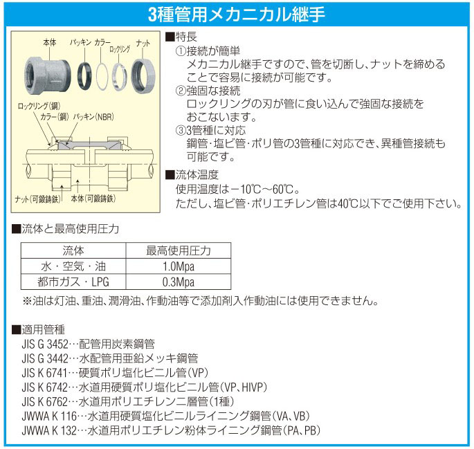 鋼管・・・配管用炭素鋼鋼管(JIS G 3452)、水配管用亜鉛めっき鋼管(JIS G 3442)、水道用硬質塩化ビニルライニング鋼管(VA・VB)、水道用ポリエチレン粉体ライニング鋼管(PA・PB)