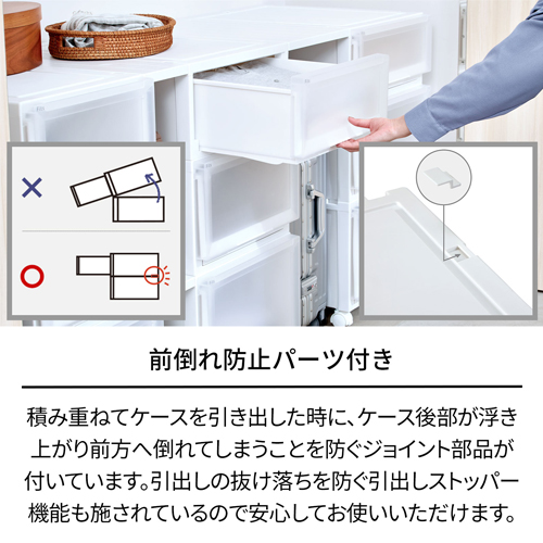 | 積み重ねて引出しを引いたときの前倒れを防ぐ、前倒れジョイント具付き。 |