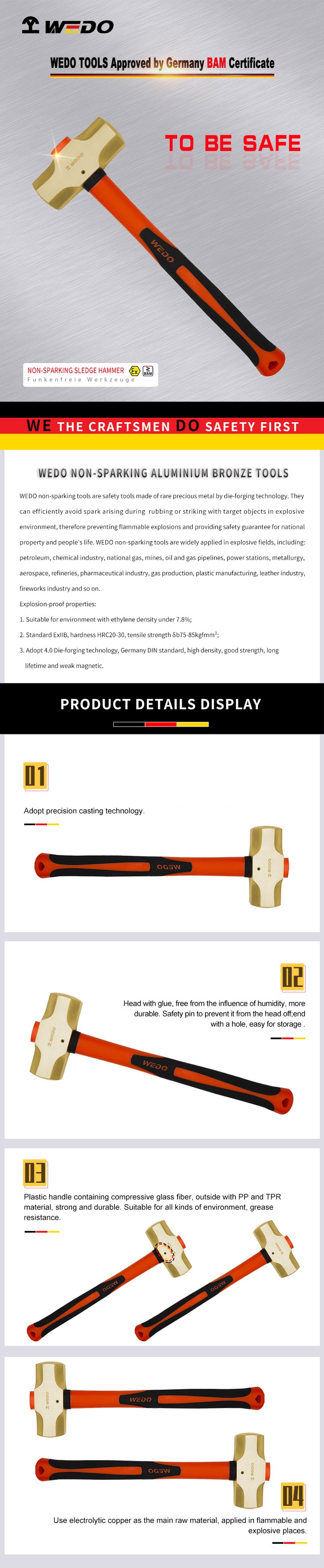 | ヘッドはアルミニウム青銅製で、石油、化学、鉱山、発電所、ガス製造、プラスチック製造など可燃性・爆発性のある場所で使用可能 |