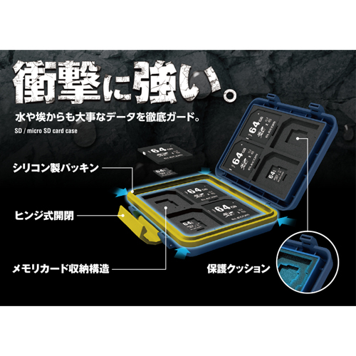 SDカードとmicroSDカードをコンパクトに収納できる耐衝撃メモリカードケースです。
