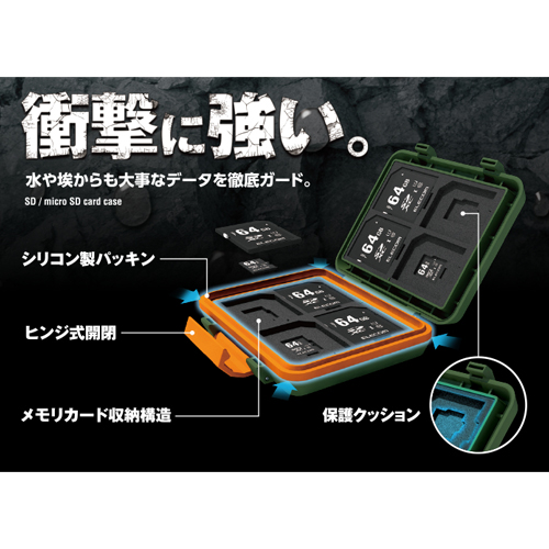 SDカードとmicroSDカードをコンパクトに収納できる耐衝撃メモリカードケースです。