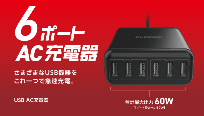 対応機種USB Type-Aポートから合計最大5V/12A(両端のポートからそれぞれ内側に連続する3ポートの合計は最大6A(1ポートあたり最大2.4A))までの出力で充電可能な機器とその組み合わせポート数USB Type-A×6
