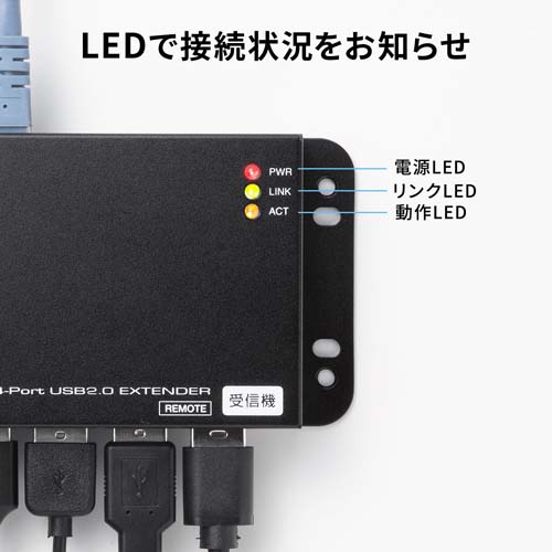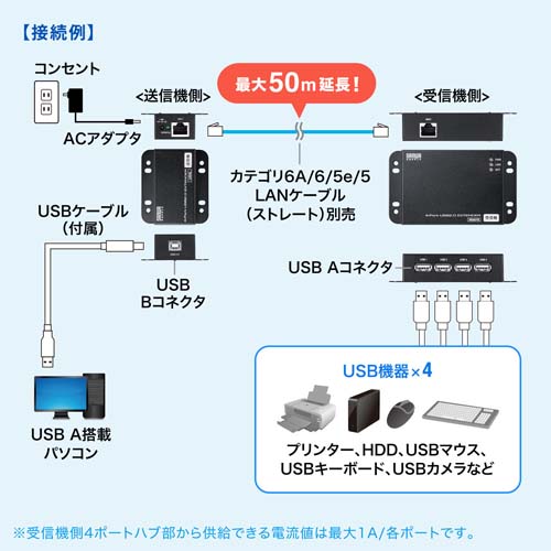 | 通常のUSBケーブル延長では届かない離れた場所に、USBカメラやスキャナ、プリンターなどを有線接続で接続したい場合に便利 |