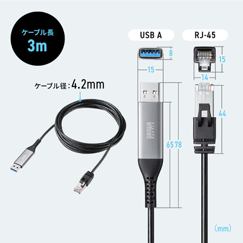 | コネクタ形状 | USB A - RJ-45 | ケーブル長 | 3m |