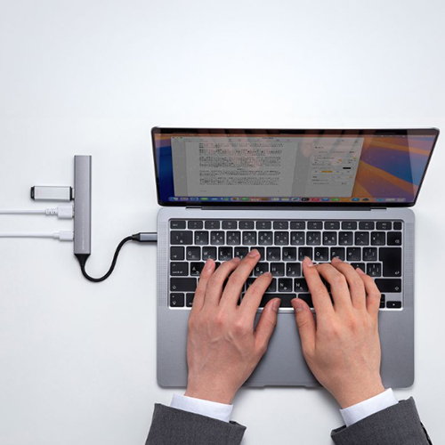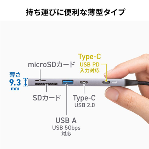 薄さわずか9.3mmの超スリムなUSBハブ、カバンの中にしまいやすいコンパクトサイズなので、出張や在宅ワークなど、移動が多い方に最適