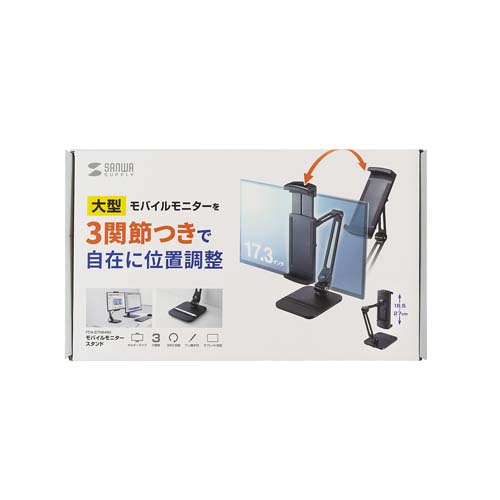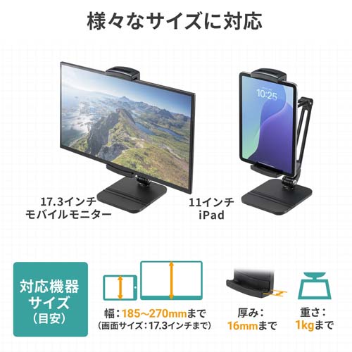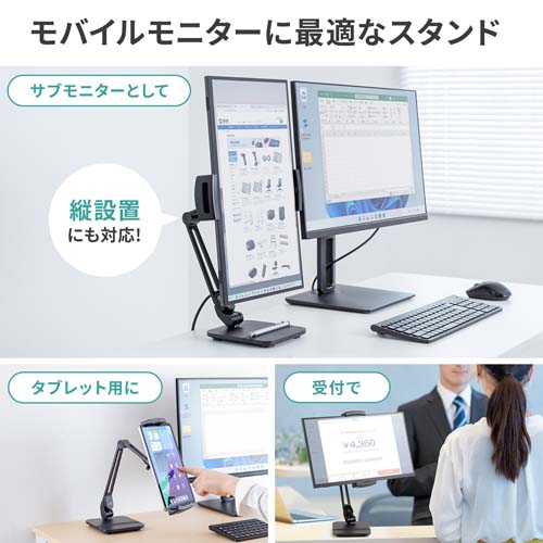 | 17.3インチまでのモバイルモニターやタブレットを設置できるタブレットアームスタンド |