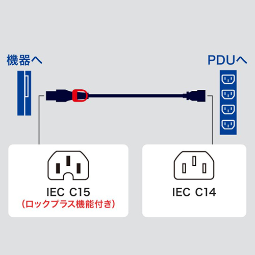ソケット側(C15)の内部構造だけでロックするため、機器側の加工や特殊なインレットは不要。