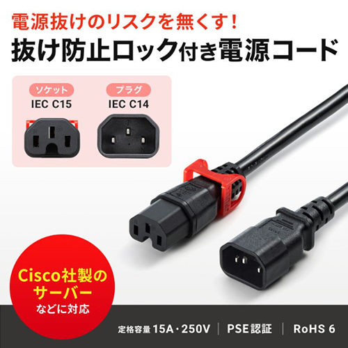 ソケット側(C15)の内部構造だけでロックするため、機器側の加工や特殊なインレットは不要。