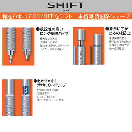 | ロング先端パイプ、金属を削りだしたローレット加工グリップ、メタルクリップなど、製図用シャープとしての特長に加え、ON/OFFの切り替えを可能とするシフト機構を搭載しました。 |