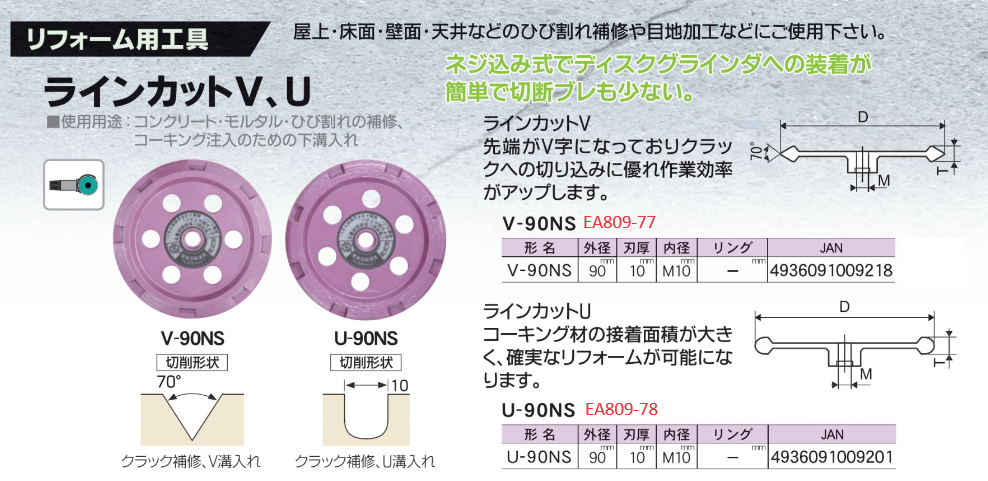 商品名ラインカットV用途コンクリート・モルタル・ひび割れの補修、コーキング注入のための下溝入れ