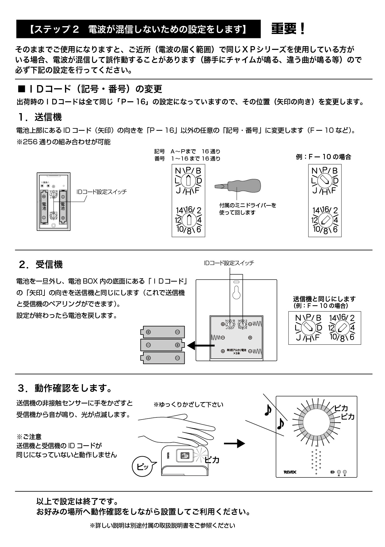 | 256通りのIDコード方式なので混信がほとんどありません。 |