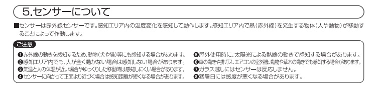 感知エリア内で熱を発生する物体(人、動物)が移動することにより作動します。