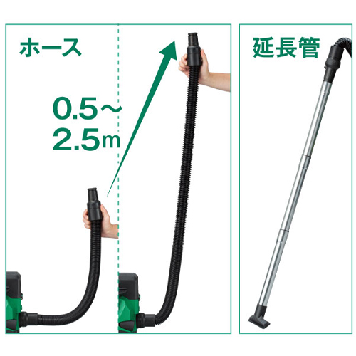 0.5~2.5mの間で動きに合わせて伸縮するホースと3本の延長管で、様々な場所に対応できます。