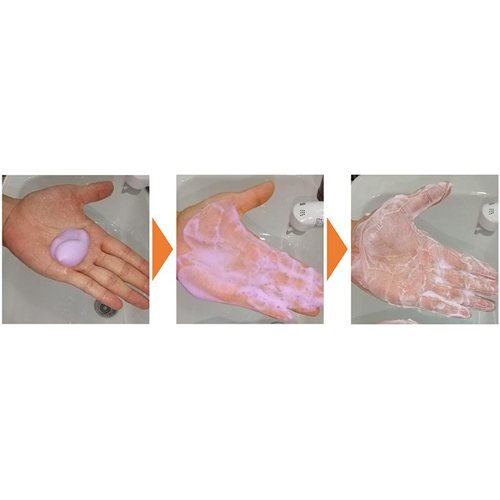 色が変わる500mlのハンドソープです。手洗いすると約30秒で白く変化します。