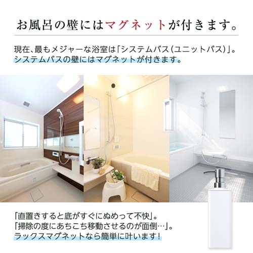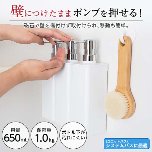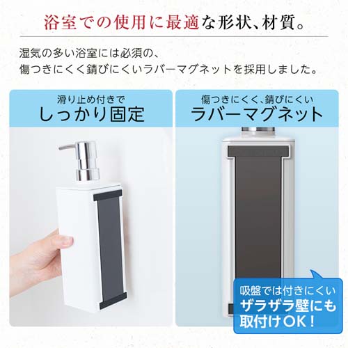 | マグネット式で浴室の壁に取り付けて、浮かせたままポンプが押せる詰替えボトル! |