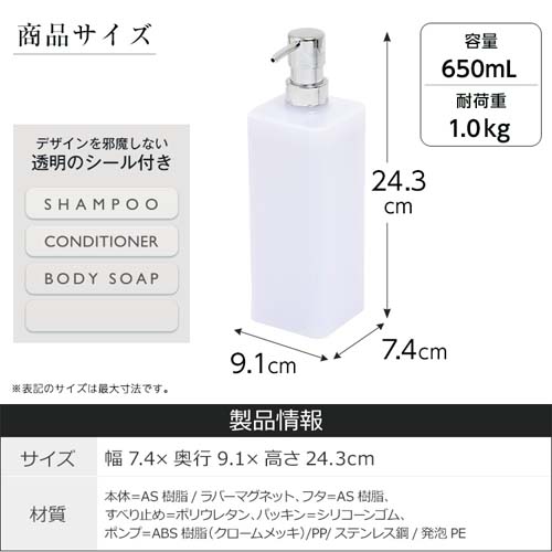 | 材質 | 本体・フタ:AS樹脂 マグネット:ラバーマグネット パッキン:シリコーンゴム すべり止め:ポリウレタン ポンプ:ABS樹脂(クロームメッキ)、PP、ステンレス鋼、発泡PE | カラー | ホワイト |