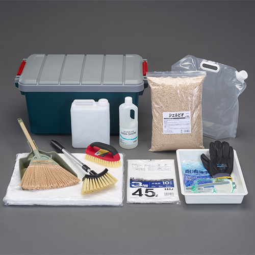 <セット内容>1L油分散洗浄剤、油吸着パッド(水分離型)×5枚、油吸着剤、ゴーグル、3Lポリ容器、洗浄ブラシ、ポリ袋(45L)×10枚、L耐切創手袋、L耐油・滑り止め手袋、10Lウォータータンク、収納ボックス、4.6Lバット希釈ブラッシング洗浄:10~30倍希釈