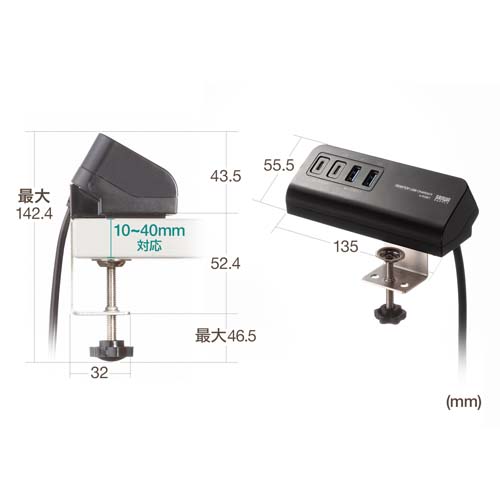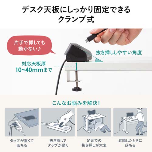 デスク天板にしっかり固定できるクランプ式のUSB充電器片手でスムーズにケーブルの抜き差しが行えます。