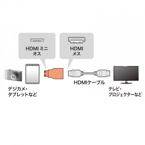 | 対応機器 | HDMIミニ端子(HDMIタイプCメスコネクタ)を持つデジタルカメラ、タブレット、パソコン、ディスプレイ、プロジェクターなど | 対応ケーブル | HDMI端子(HDMIタイプAオス)を持つHDMIケーブル |