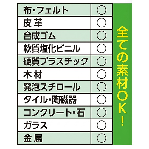 〈使用できない箇所〉 砂壁などの付着しにくい場所 高価格品 多孔質(コンクリート・木・布地など)で水に浸かる場所 ※材料の種類や使用条件によって、接着強さは異なります。 ※特殊加工(シリコン、フッ素、はっ水、工業用ゴムなど)されたところにはつかない場合があります。 |