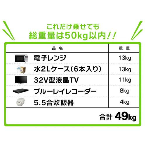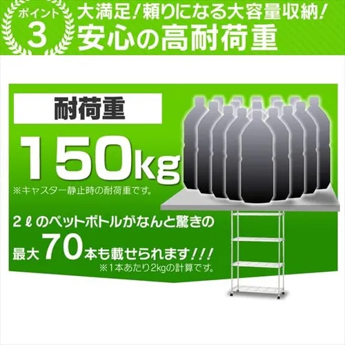 重量 | 5.4kg | 耐荷重 | 全体(静止時)約150kg 全体(移動時)約75kg 棚板1枚当たり約50kg |