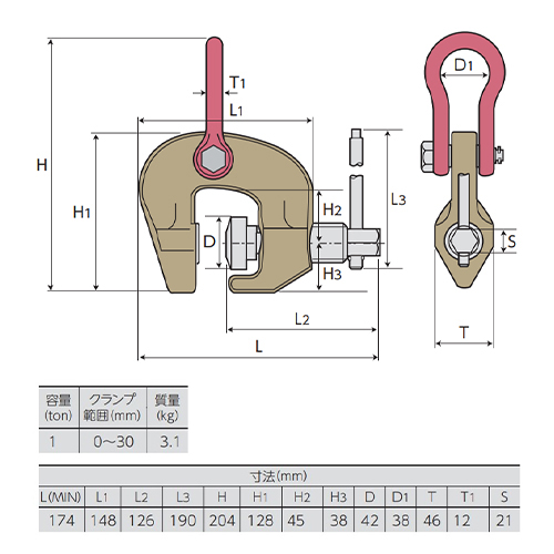 | 使用荷重 | 1t | クランプ範囲 | 0~30mm |