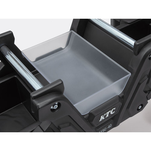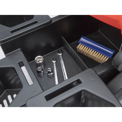 | 収納はポケット(6箇所)・トレイ(2箇所)・透明トレイと工具・スプレー缶・部品類を収納できます。 |