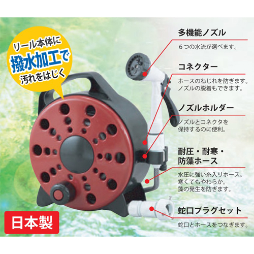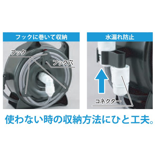 リール本体にホースを収納することで太陽光(紫外線)によるホースの劣化を防ぎます。 |