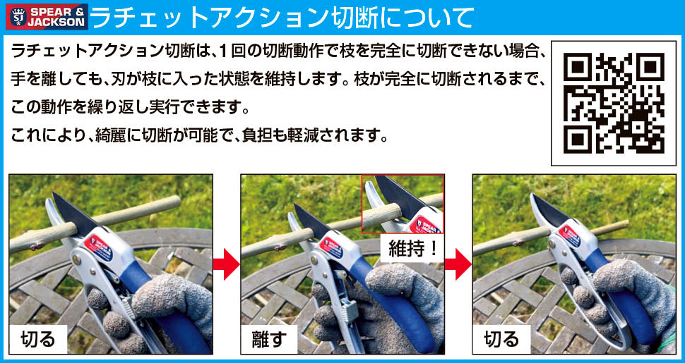 | ラチェットアクション切断は、1 回の切断動作で枝を完全に切断できない場合、手を離しても、刃が枝に入った状態を維持します。枝が完全に切断されるまで、この動作を繰り返し実行できます。これにより、綺麗に切断が可能で、負担も軽減されます。 |