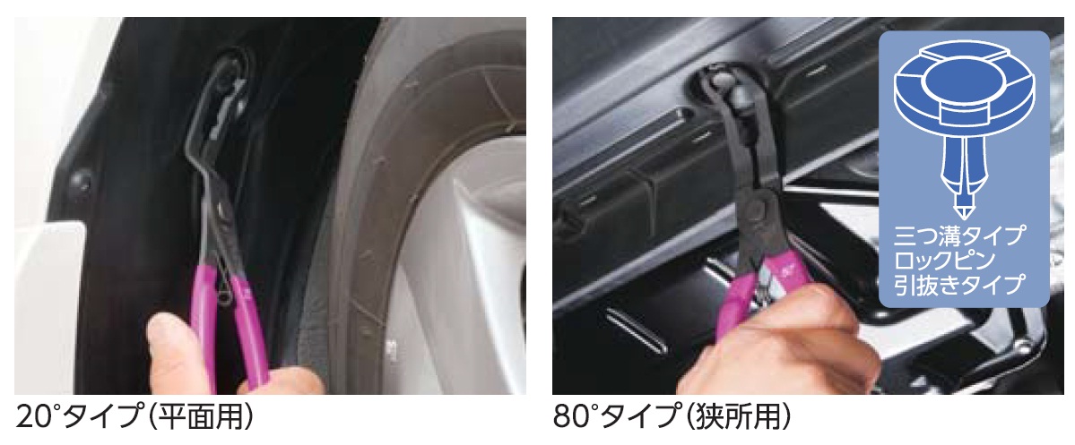 自動車のタイヤハウス内、アンダーカバー、前後バンパー等に使用されている三つ溝タイプロックピン引抜きタイプ樹脂製クリップの取り外し、装着時の軸部の縮め・挿入に