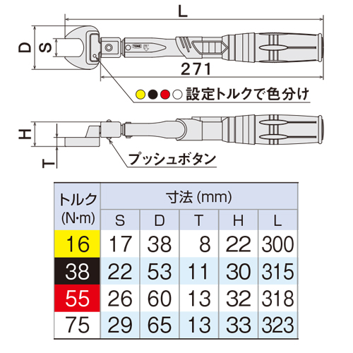 | 口径×トルク(N・m) | 17mm×22・22mm×38・26mm×55・29mm×75 | 適合フレアナット | 1/4”・3/8”・1/2”・5/8” |