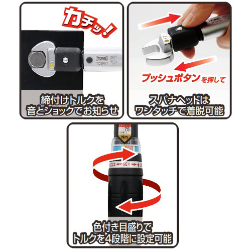 | 締付けトルクを「カチッ」という音と軽いショックでお知らせ |