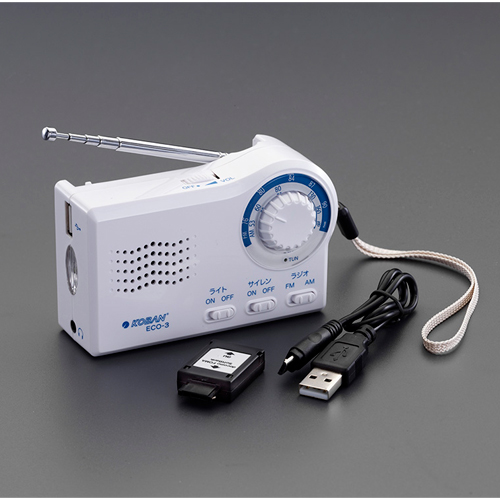 乾電池または手まわしでラジオ、LEDライト、スマートフォン、携帯電話の充電ができます。とても便利です。 携帯電話への充電は1分間の手回し充電で約60分の待ち受けができます(通話は約2分)。 スマートフォンへの充電は5分間の手回し充電で約30分の待受けができます(通話は約3分)。 ラジオは約15分、ライトは約10分、サイレンは約3分使用できます。 |