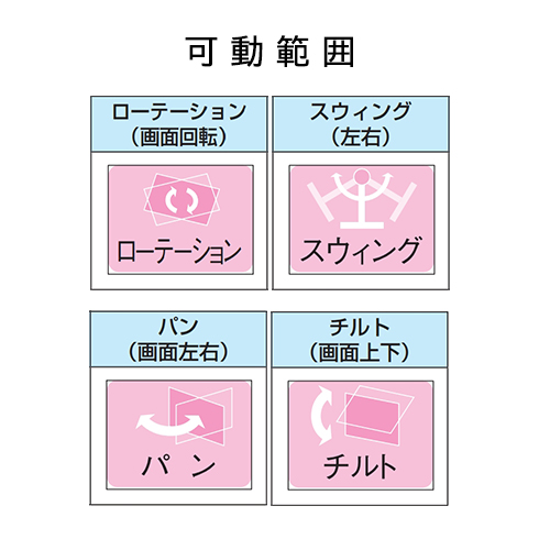 | アーム長 | 565mm | 可動範囲 | 画面上下(チルト):145° 画面左右(パン):180° 画面回転(ローテーション):180° 左右(スウィング):240° |