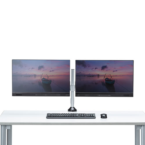 | 2面モニタ搭載可能。水平多関節モニタアーム。天板固定可能。 |
