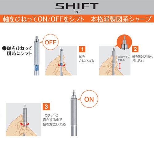 | ロング先端パイプ、金属を削りだしたローレット加工グリップ、メタルクリップなど、製図用シャープとしての特長に加え、ON/OFFの切り替えを可能とするシフト機構を搭載しました。 |