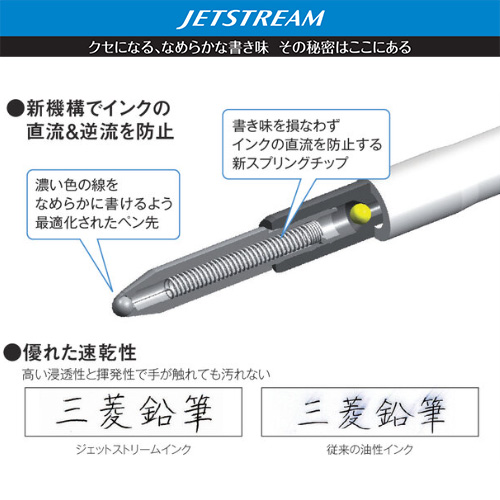 「クセになる、なめらかな書き味。」を実現した、世界初の画期的な新開発インクを搭載し、既存の油性ボールペンと比較して、『JETSTREAM』は筆記速度に関わらず、低い筆記抵抗でなめらかな書き味を実現しました。