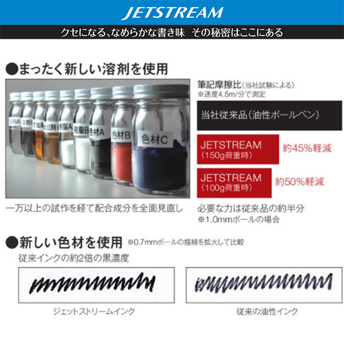「クセになる、なめらかな書き味。」を実現した、世界初の画期的な新開発インクを搭載し、既存の油性ボールペンと比較して、『JETSTREAM』は筆記速度に関わらず、低い筆記抵抗でなめらかな書き味を実現しました。