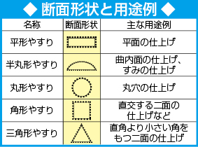 ダイヤモンドやすりの上手な使い方 A.できるだけ湿式研削を行ってください。乾式よりも切れ味がよく長持ちします。 B.目づまりした場合は歯ブラシでよく洗浄してください。 C.特に目づまりの著しい時はダイヤの部分を硝酸溶液に数秒浸し、水で充分洗ってください。 必要以上に長く浸しますとかえって逆効果をまねき、精度も落ち、寿命も縮みますのでご注意ください。 超硬質合金、セラミックス・サーメット・ガラス等には使用しないでください。 |