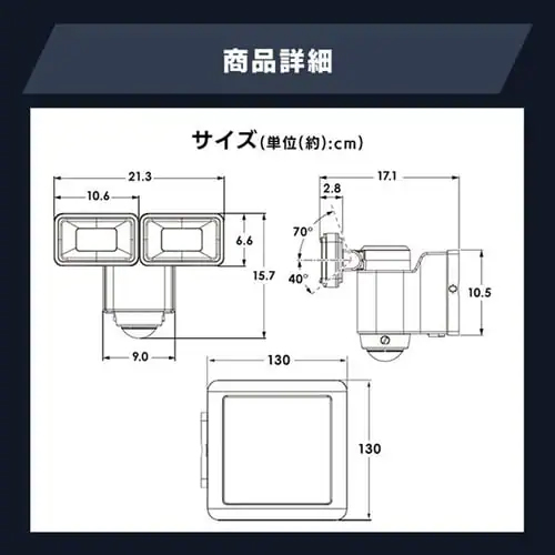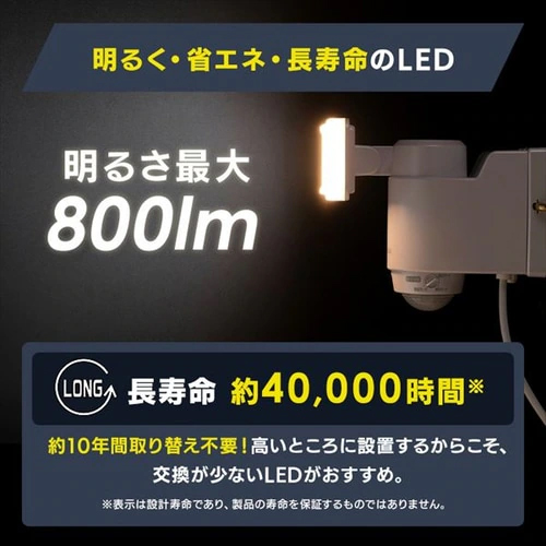 全光束(最大) 800ml(防犯/常灯モード、明るさ強) 使用環境温度-10~40℃