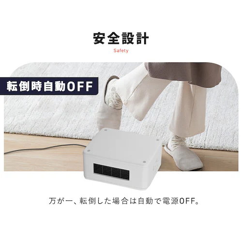 万が一転倒した場合は自動的に電源がOFFになる[転倒時自動OFF]機能搭載です。