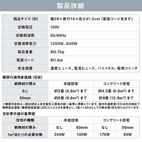 | 最大消費電力 | 1200W | 適用床面積 | 木造住宅(断熱材の厚みなし):約3畳(4.9㎡)まで コンクリート住宅(断熱材の厚みなし):約4.5畳(6.9㎡)まで 木造住宅(断熱材の厚み50mm):約6畳(8.6㎡)まで コンクリート住宅(断熱材の厚み50mm):約8畳(12.9㎡)まで |