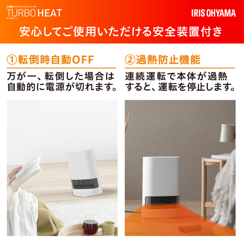 | 転倒時自動オフ機能搭載で、万が一転倒した場合は自動的に電源が切れるので安心安全です。 |