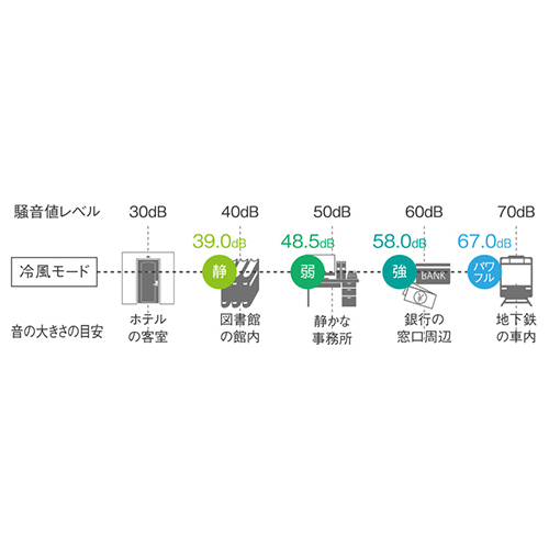 風量調節可能(冷風:パワフル・強・弱・静、送風:パワフル・強・弱)