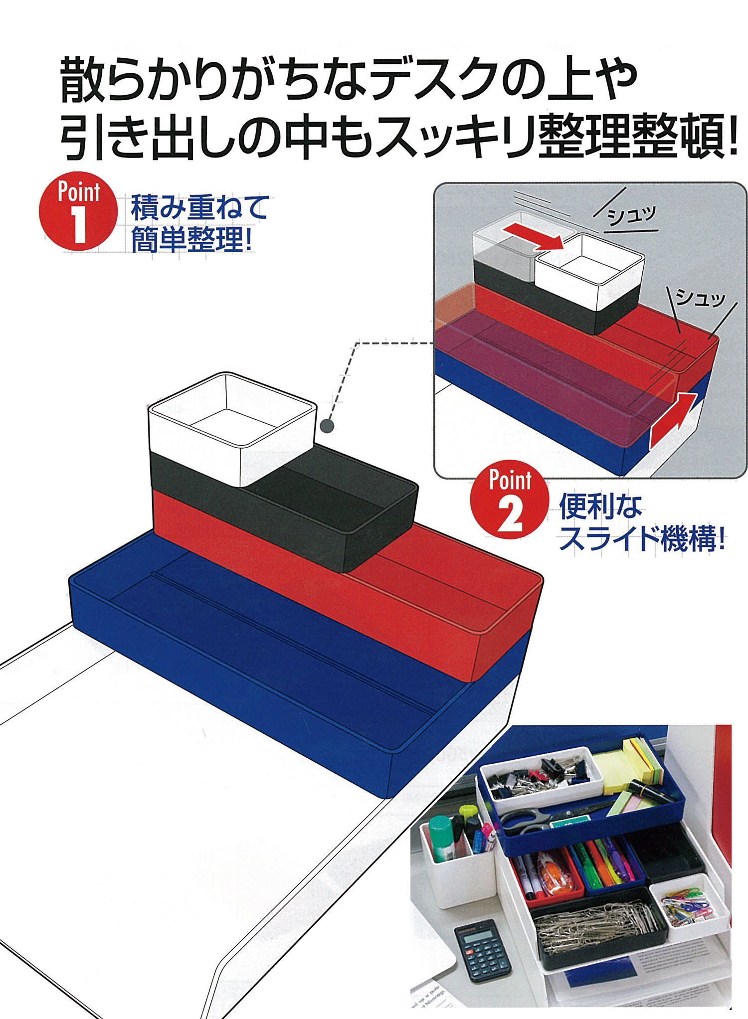 散らかりがちなデスクの上や引き出しの中もスッキリ整理整頓