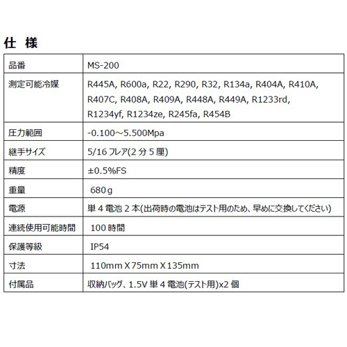| 圧力範囲 | -0.1~5.5MPa | 電源 | 単4電池×2本(付属) |